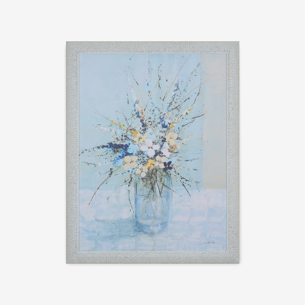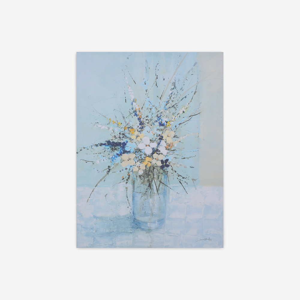 화병에 꽂은 여러가지 꽃들과 꽃가지를 정돈된 형상으로 표현하고 있다. 화려한 색상으로 묘사하지 않고 순수하고 은은한 색깔로 표현하여 감각적인 청량감을 주고, 정서적 안정감과 편안한 분위기를 느끼게 한다.
