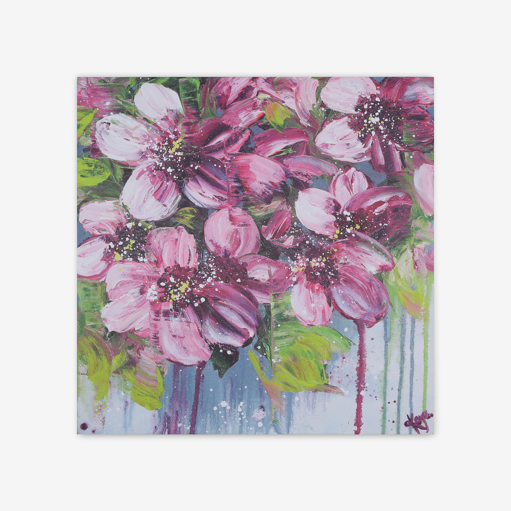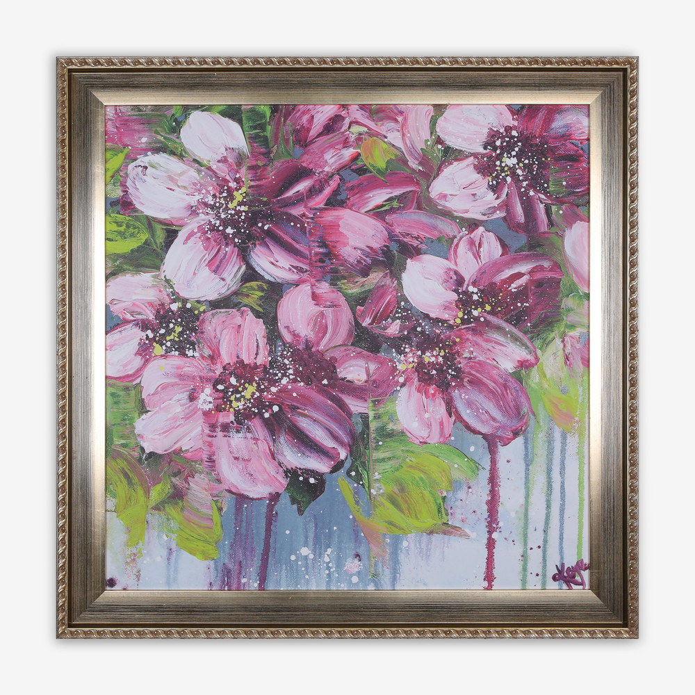 보라색의 꽃이 활짝 피어 있는 아름답고 싱그러운 꽃 들을 짙고 연한 색감으로 붓터치수 마감 기법으로 표현하고 있다. 거칠고 두꺼운 터치감으로 사실감과 생동감을 더해주고 있다. 꽃의 자연미와 조형미를 조화롭게 묘사하여 작가의 강한 생각과 감정을 담아 화려하고 아름답게 표현하고 있다. 보라색이 주는 신성함과 고귀한 이미지로 색상의 화려함과 색채의 사치스러움을 강조하여 시각적인 우아함을 보여주고 있다.