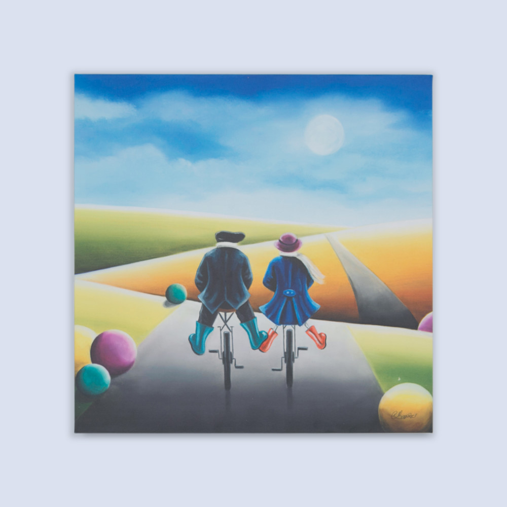 자연을 사실적인 아름다움과 이상적인 아름다움으로 표현하고 있다. 나무와 건물의 형상을 단순화하여 작가의 다양한 감정을 뚜렷하게 표현하고 있다. 하늘의 파란색은 희망과 평화의 상징을 표현하고 구름 사이로 비치는 태양은 생기와 따뜻함을 세상에 비춰주는 의미를 담고 있다. 그곳을 향해 자전거를 타고가는 두 사람의 뒷모습은 현실세계와 이상세계의 희망을 찾아가고 있는 설레이는 모습을 감상자에게 전하고 있다. 길 사이로 뻗어있는 언덕과 하늘의 경계선은 원근법적 시각을 묘사하고 태양이 비치는 들판과 나무의 색상표현과 원통모양의 집묘사는 인상파 화풍이다. 명확한 선의 묘사는 작품의 윤곽이 안정적이고 촉각성과 시각성의 대비를 잘 표현하고, 칼라와 칼라 사이의 빛의 색상은 명암 대비를 표현하고 있다. 눈부신 색채는 시적인 호소력을 담아 상징적이고 미학적인 이미지를 구현하고, 감상자에게 원초적인 향수와 이상적인 동경을 표현하고 있다.